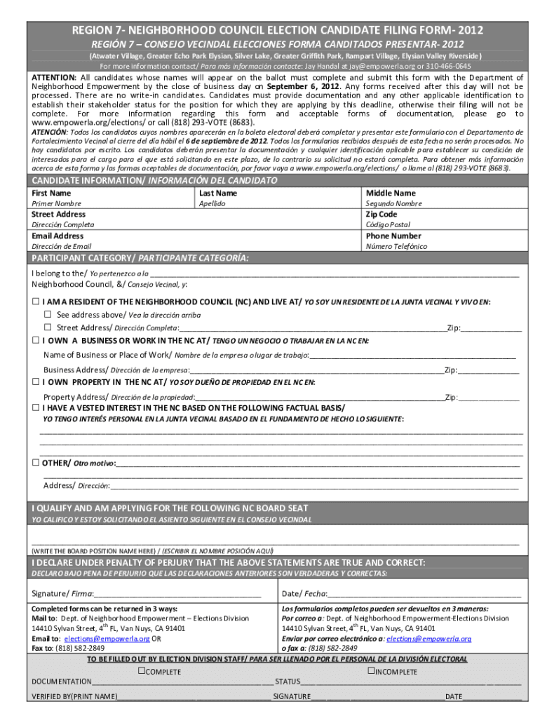 REGION 7 NEIGHBORHOOD COUNCIL ELECTION CANDIDATE FILING FORM 2012 REGIN 7 CONSEJO VECINDAL ELECCIONES FORMA CANDITADOS PRESENTAR 2012(Atwater Village, Greater Echo Park Elysian, Silver Lake, Greater