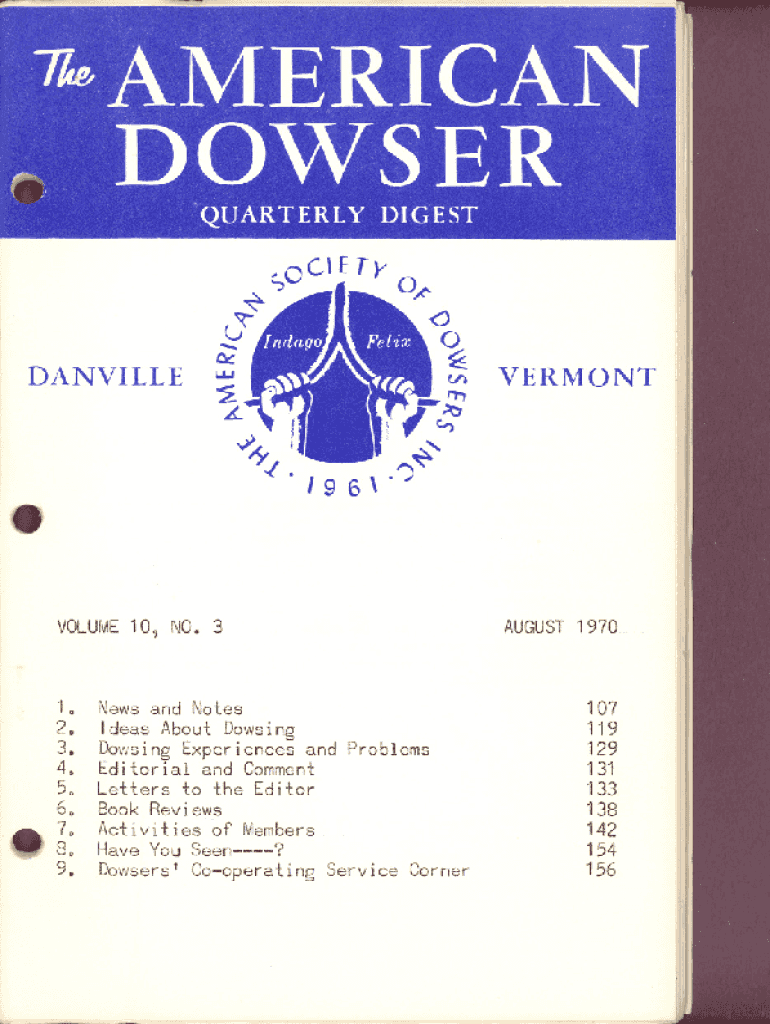 \"OCETyO_v DANVILLE0) _ L.tn \"\"t\"II.l ( 4\' \'I\'9 6 . ..;VOLUME 10, NO.31. 2. 3. 4. 5. 6. 7. 8. 9.VERMONTNews and Notes Ideas About Dowsing Dowsing Experiences and Problems Editorial and Comment