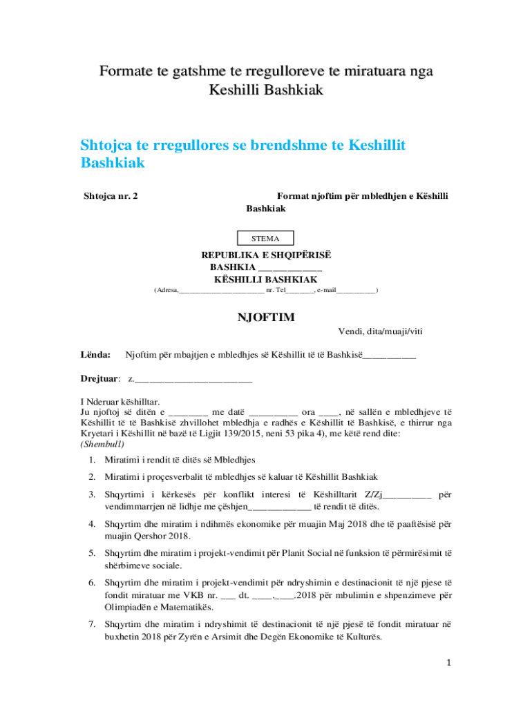 Formate te gatshme te rregulloreve te miratuara nga Keshilli BashkiakShtojca te rregullores se brendshme te Keshillit Bashkiak Shtojca nr. 2Format njoftim pr mbledhjen e Kshilli Bashkiak STEMAREPUBLIKA