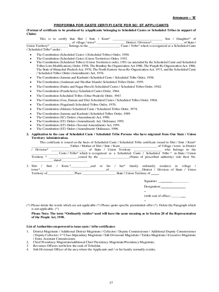 Annexure B PROFORMA FOR CASTE CERTIFICATE FOR SC/ST APPLICANTS (Format of certificate to be produced by aApplicants belonging to Scheduled Castes or Scheduled Tribes in support of Claim) This is to