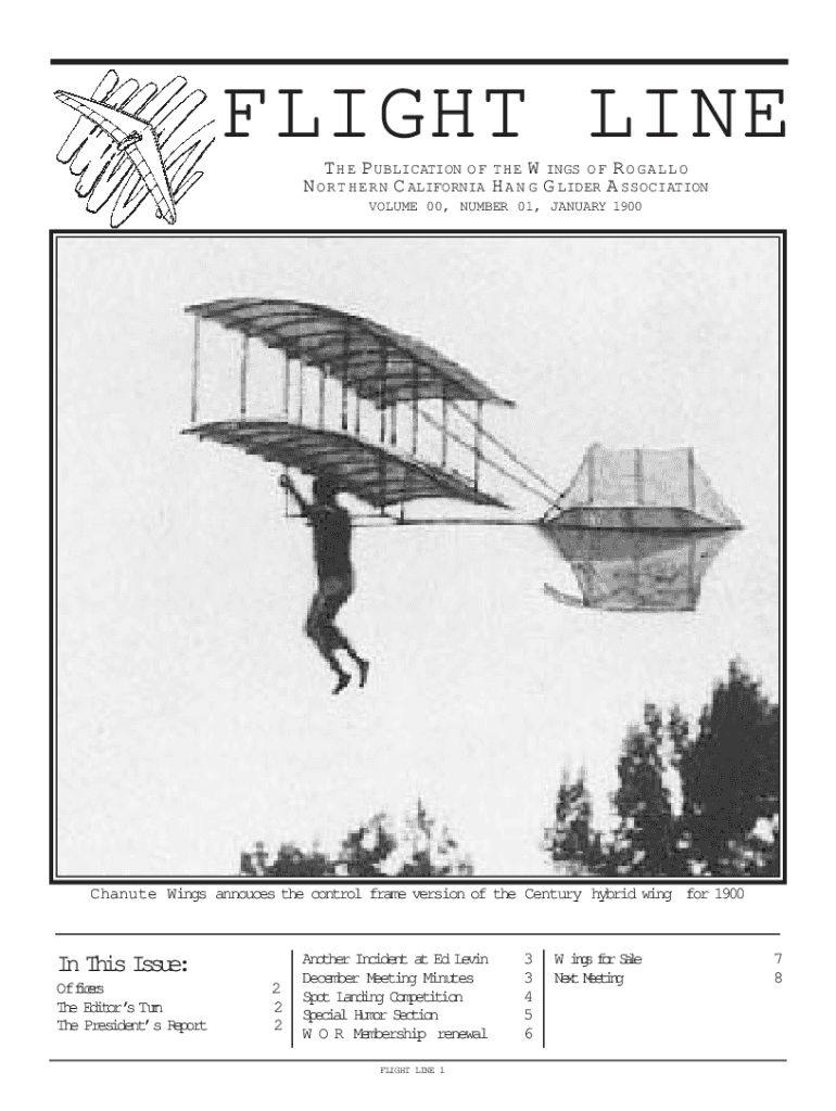 FLIGHT LINE TH E P UBLICATION O F THE W INGS O F R O G A L L O N O R T H E R N C ALIFORNIA H A N G G LIDER A SSOCIATION VOLUME 00, NUMBER 01, JANUARY 1900Chanute Wings annouces the control frame version