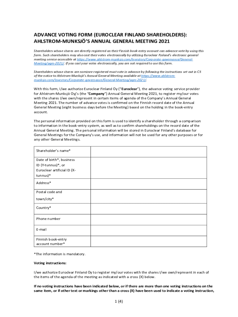 ADVANCE VOTING FORM (EUROCLEAR FINLAND SHAREHOLDERS): AHLSTROMMUNKSJS ANNUAL GENERAL MEETING 2021 Shareholders whose shares are directly registered on their Finnish bookentry account can advance vote