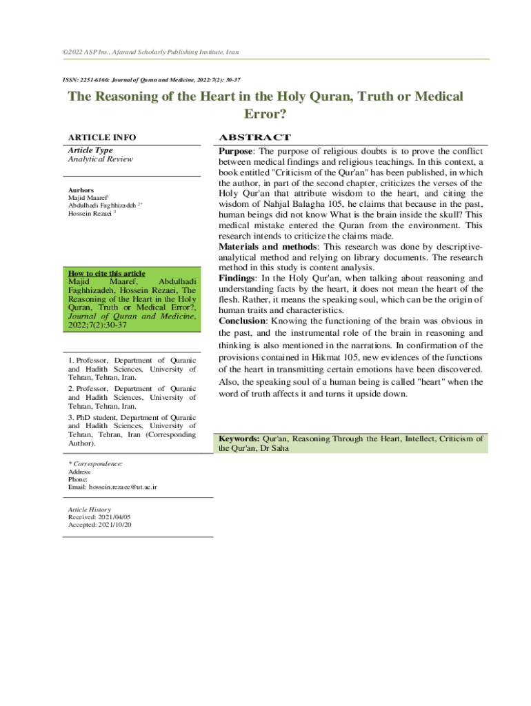 2022 ASP Ins., Afarand Scholarly Publishing Institute, IranISSN: 22516166: Journal of Quran and Medicine, 2022:7(2): 3037The Reasoning of the Heart in the Holy Quran, Truth or Medical Error? ARTICLE