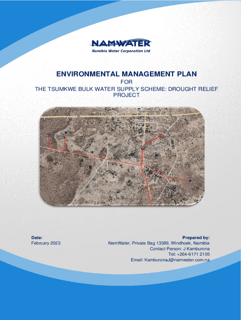 ENVIRONMENTAL MANAGEMENT PLAN FOR THE TSUMKWE BULK WATER SUPPLY SCHEME: DROUGHT RELIEF PROJECTDate: February 2023Prepared by: NamWater, Private Bag 13389, Windhoek, Namibia Contact Person: J Kamburona