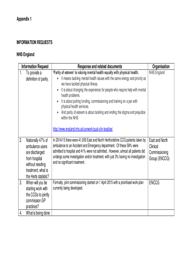 Appendix 1INFORMATION REQUESTS NHS England Information Request 1. To provide a definition of parity. Response and related documents Parity of esteem is valuing mental health equally with physical