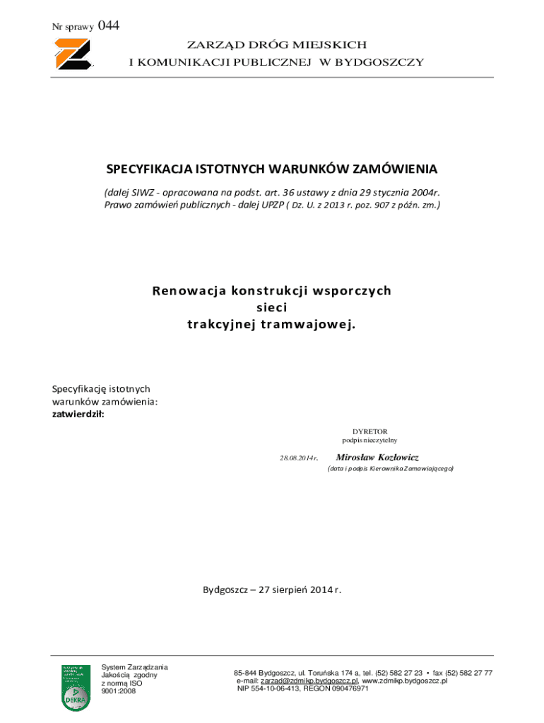 Nr sprawy044 ZARZD DRG MIEJSKICH I KOMUNIKACJI PUBLICZNEJ W BYDGOSZCZYSPECYFIKACJA ISTOTNYCH WARUNKW ZAMWIENIA (dalej SIWZ opracowana na podst. art. 36 ustawy z dnia 29 stycznia 2004r. Prawo zamwie