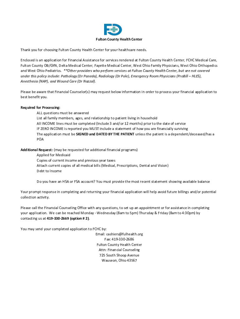 Fulton County Health Center Thank you for choosing Fulton County Health Center for your healthcare needs. Enclosed is an application for Financial Assistance for services rendered at Fulton County