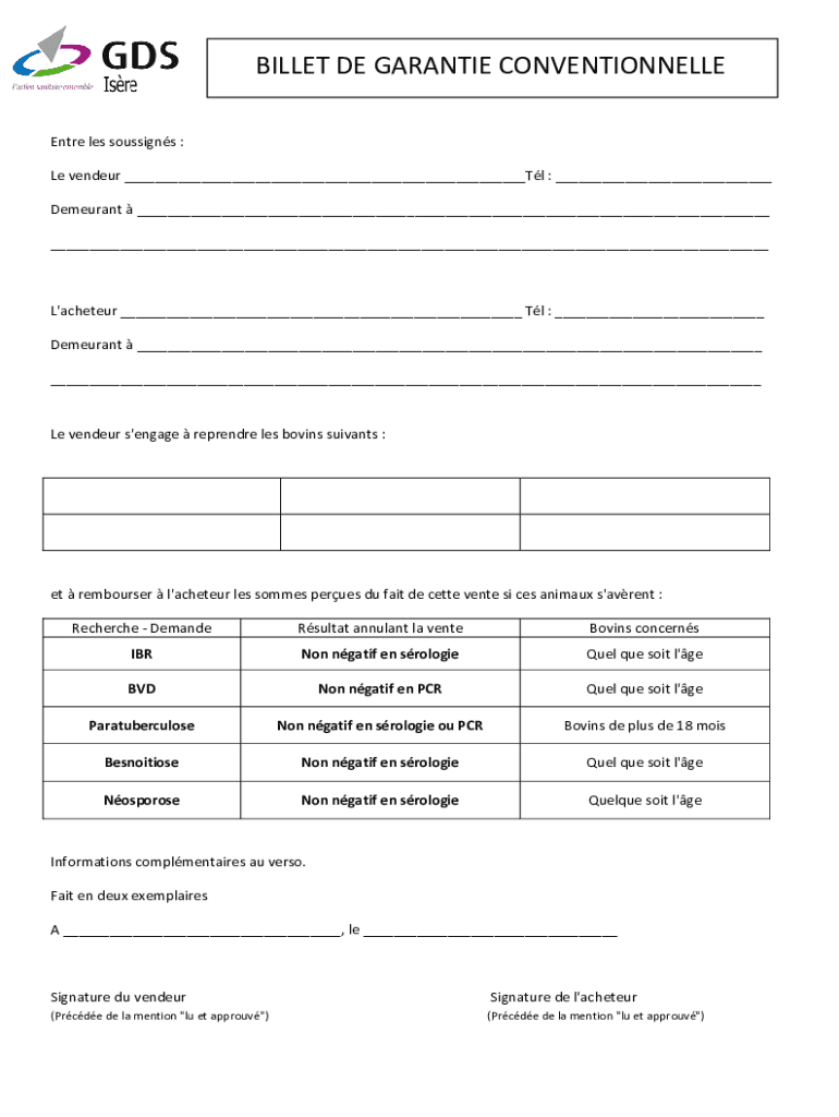 BILLET DE GARANTIE CONVENTIONNELLE Entre les soussigns : Le vendeur ___Tl : ___ Demeurant ___ ___L\'acheteur ___ Tl : ___ Demeurant ___ ___Le vendeur s\'engage reprendre les bovins suivants :et rembourser