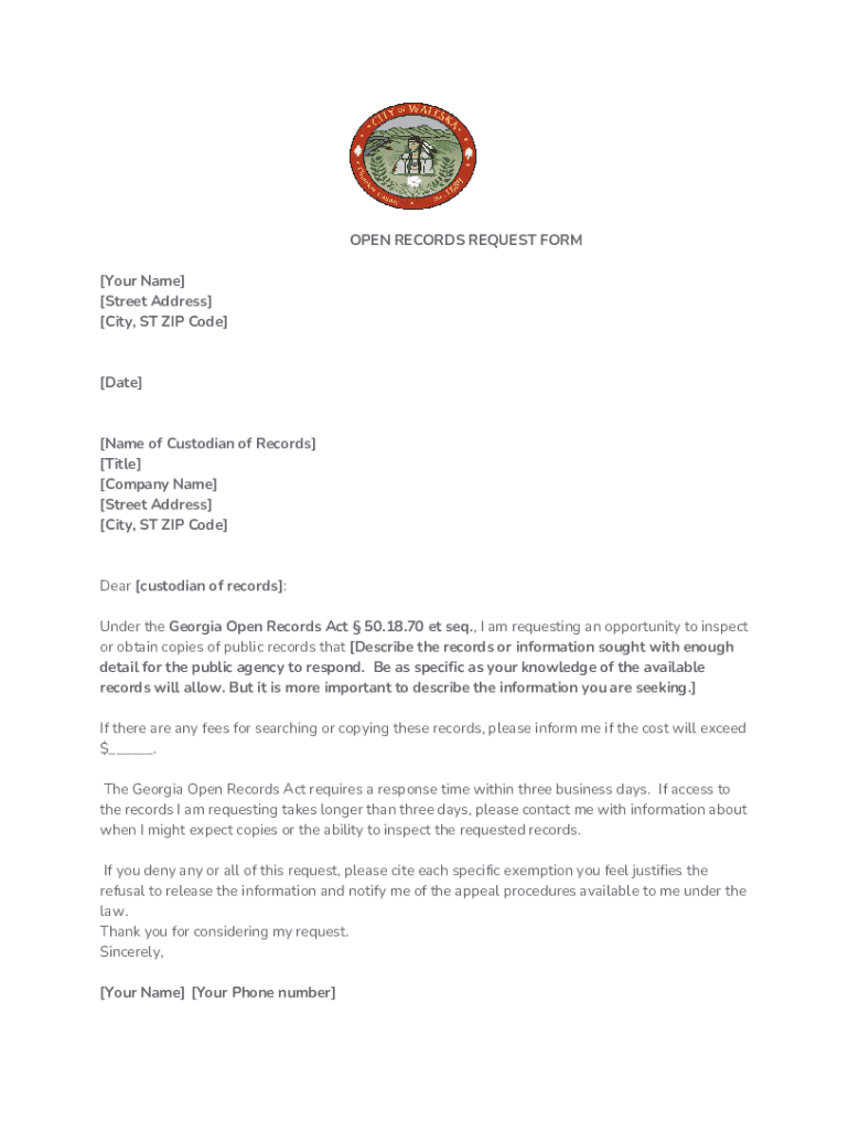 OPEN RECORDS REQUEST FORM [Your Name] [Street Address] [City, ST ZIP Code][Date][Name of Custodian of Records] [Title] [Company Name] [Street Address] [City, ST ZIP Code]Dear [custodian of records]: