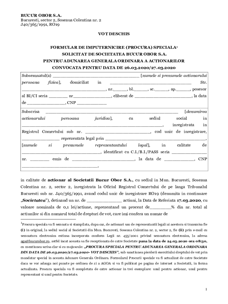 BUCUR OBOR S.A. Bucuresti, sector 2, Soseaua Colentina nr. 2 J40/365/1991, RO19 VOT DESCHIS FORMULAR DE IMPUTERNICIRE (PROCURA) SPECIALA1 SOLICITAT DE SOCIETATEA BUCUR OBOR S.A. PENTRU ADUNAREA GENERALA