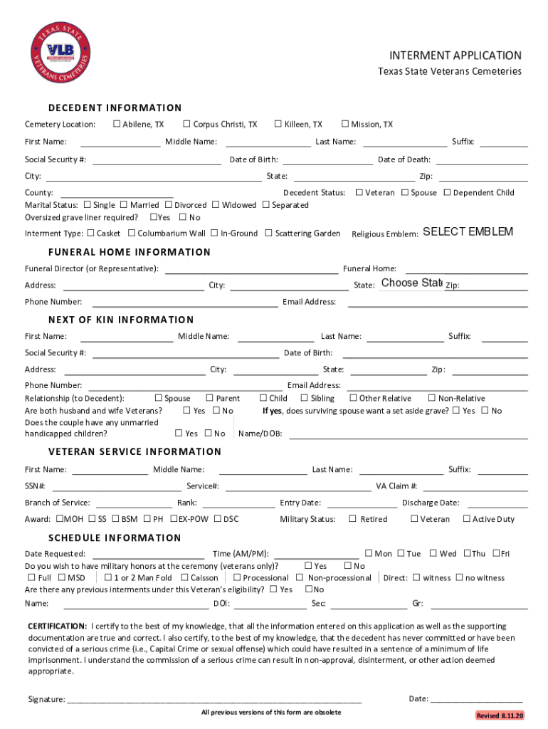 INTERMENT APPLICATION Texas State Veterans Cemeteries DECEDENT INFORMATION Cemetery Location:Abilene, TXFirst Name:Corpus Christi, TXKilleen, TXMiddle Name:Mission, TXLast Name:Social Security #:Suffix:Date