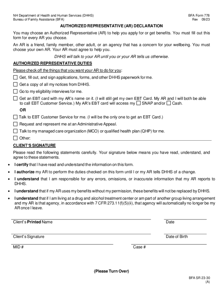 NH Department of Health and Human Services (DHHS) Bureau of Family Assistance (BFA)BFA Form 778 Rev 09/23AUTHORIZED REPRESENTATIVE (AR) DECLARATION You may choose an Authorized Representative (AR)