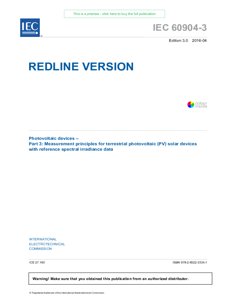 This is a preview click here to buy the full publicationIEC 609043 Edition 3.0 201604REDLINE VERSION colour insidePhotovoltaic devices Part 3: Measurement principles for terrestrial photovoltaic (PV)
