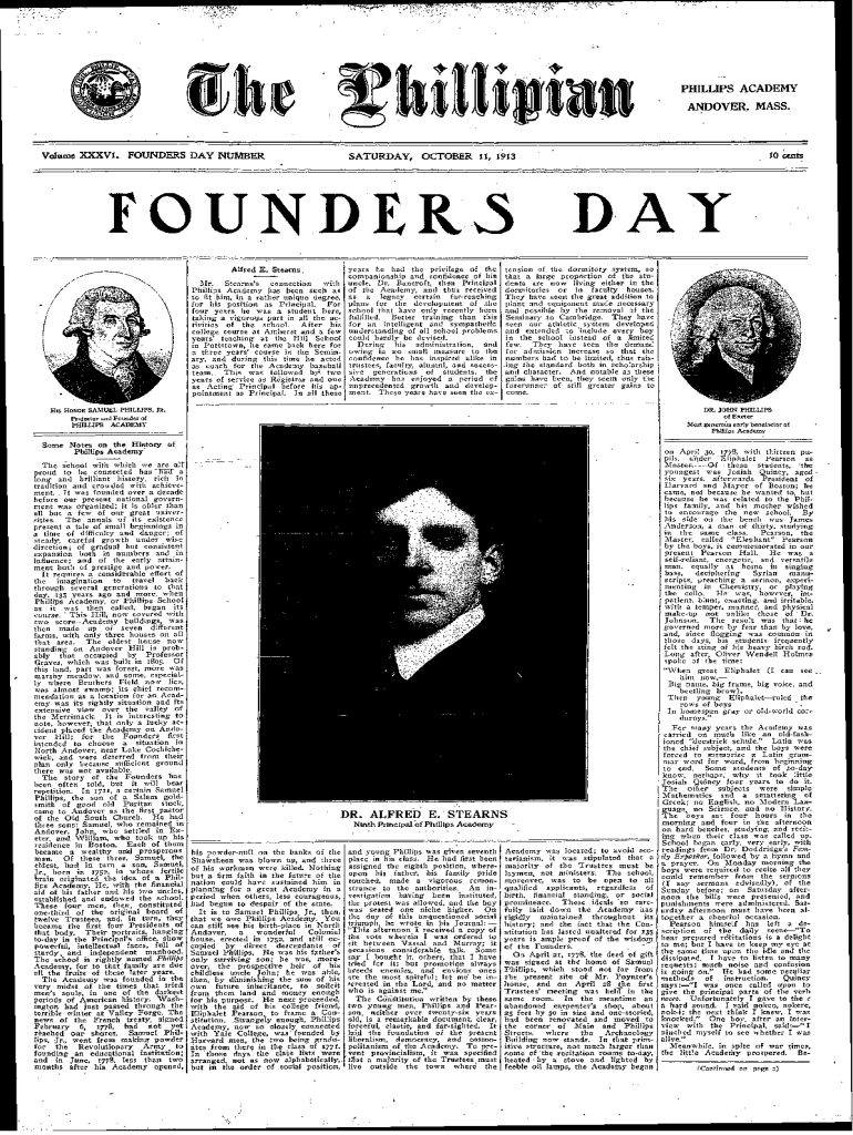 PHILLIPS ACADEMYANDOVER, MASS. Volume XXXVI.FOUNDERS Alfred E. Stearns .,y te,,\'\',i/ Ir. Stearns\'s connection with Phillips Academy has been such as to fit him, in a rather unique degree, for his