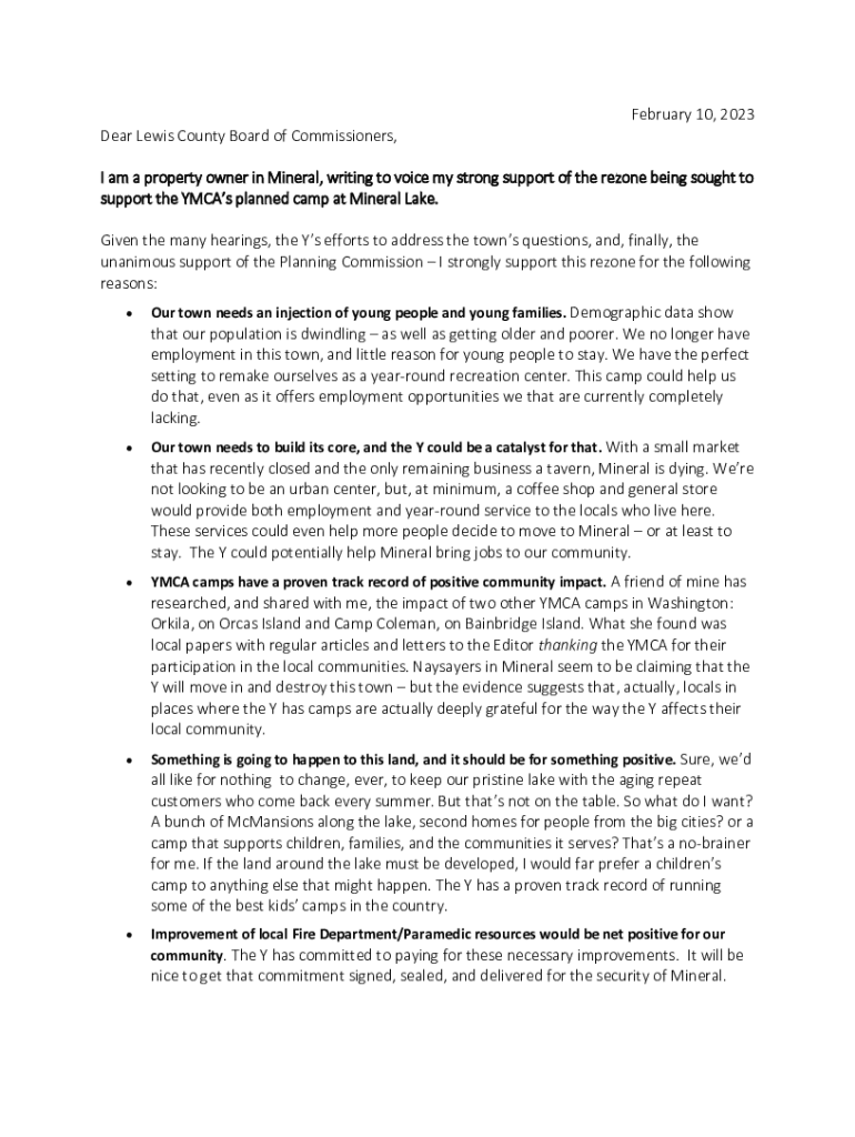 Dear Lewis County Board of Commissioners,February 10, 2023I am a property owner in Mineral, writing to voice my strong support of the rezone being sought to support the YMCAs planned camp at Mineral