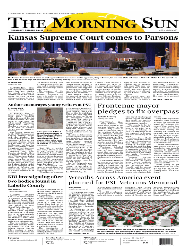 COVERING PITTSBURG AND SOUTHEAST KANSAS SINCE 1887MORNINGSUN.NETWEDNESDAY, OCTOBER 5, 2022 | $1.25Kansas Supreme Court comes to ParsonsThe Kansas Supreme Court hears an oral argument from the counsel