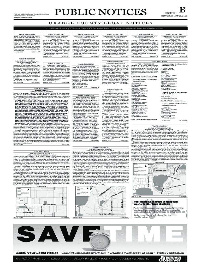 Find your notices online at: OrangeObserver.com, FloridaPublicNotices.com and BusinessObserverFL.comPUBLIC NOTICESSECTIONBTHURSDAY, MAY 25, 2023ORANGE COUNTY LEGAL NOTICES **Additional Public Notices