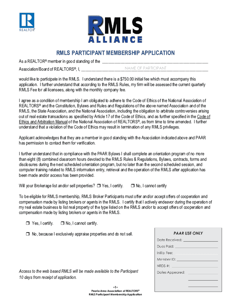 RMLS PARTICIPANT MEMBERSHIP APPLICATION As a REALTOR member in good standing of the ___ NAME OF PARTICIPANT Association/Board of REALTORS, I, ___would like to participate in the RMLS. I understand
