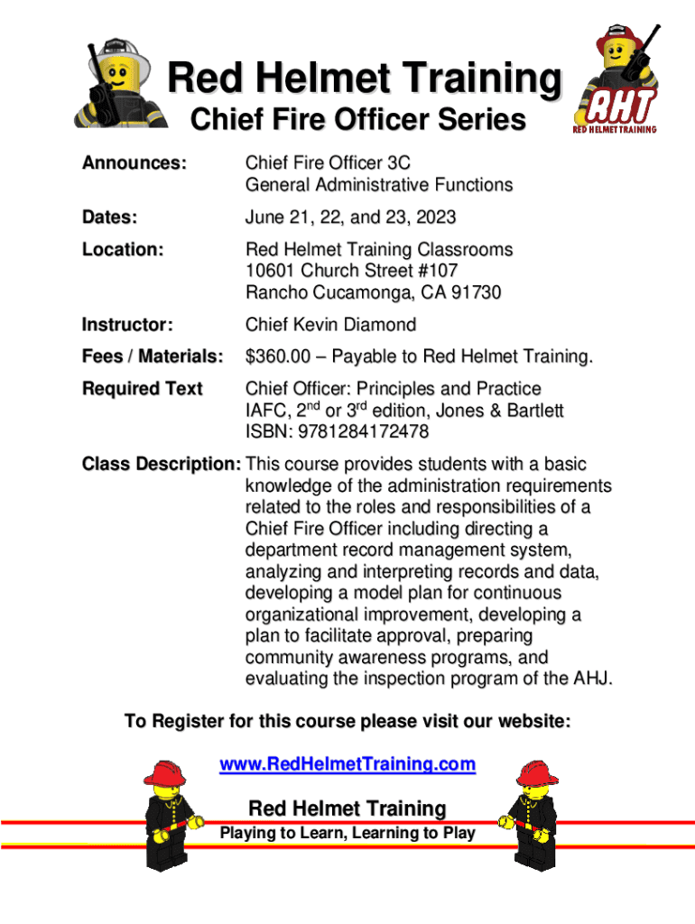 Red Helmet Training Chief Fire Officer Series Announces:Chief Fire Officer 3C General Administrative FunctionsDates:J une 21, 2 2, an d 23, 2023Location:Red Helmet Training Classrooms 10601 Church