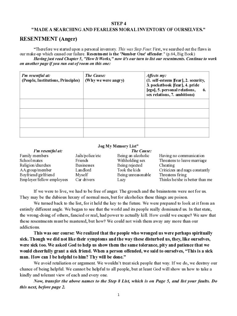 STEP 4 \"MADE A SEARCHING AND FEARLESS MORAL INVENTORY OF OURSELVES.\"RESENTMENT (Anger) Therefore we started upon a personal inventory. This was Step Four. First, we searched out the flaws in our