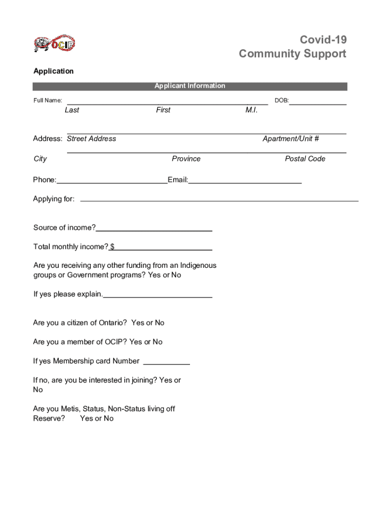 Covid19 Community Support Application Applicant Information Full Name:DOB:LastFirstM.I.Address: Street Address City Phone:Apartment/Unit # Province Email:Applying for: Source of income? Total monthly