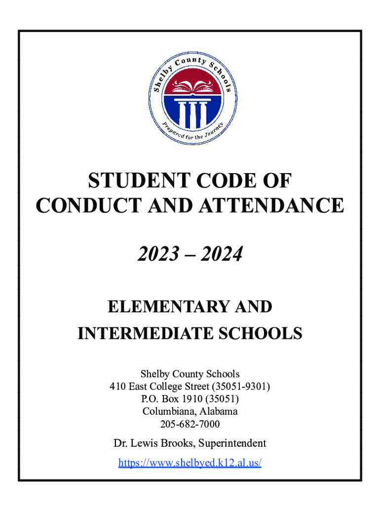 STUDENT CODE OF CONDUCT AND ATTENDANCE 2023 2024 ELEMENTARY AND INTERMEDIATE SCHOOLS Shelby County Schools 410 East College Street (350519301) P.O. Box 1910 (35051) Columbiana, Alabama 2056827000Dr.