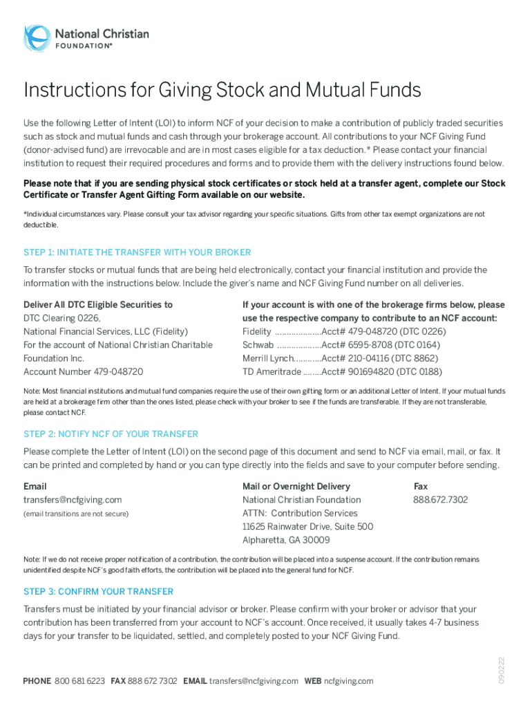 Instructions for Giving Stock and Mutual Funds Use the following Letter of Intent (LOI) to inform NCF of your decision to make a contribution of publicly traded securities such as stock and mutual