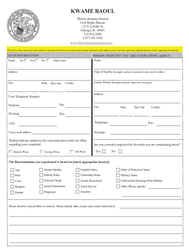 KWAME RAOUL Illinois Attorney General Civil Rights Bureau 115 S. LaSalle St. Chicago, IL 60603 3128143400 18775813692 www.IllinoisAttorneyGeneral.gov Fill out the form online and click submit at the