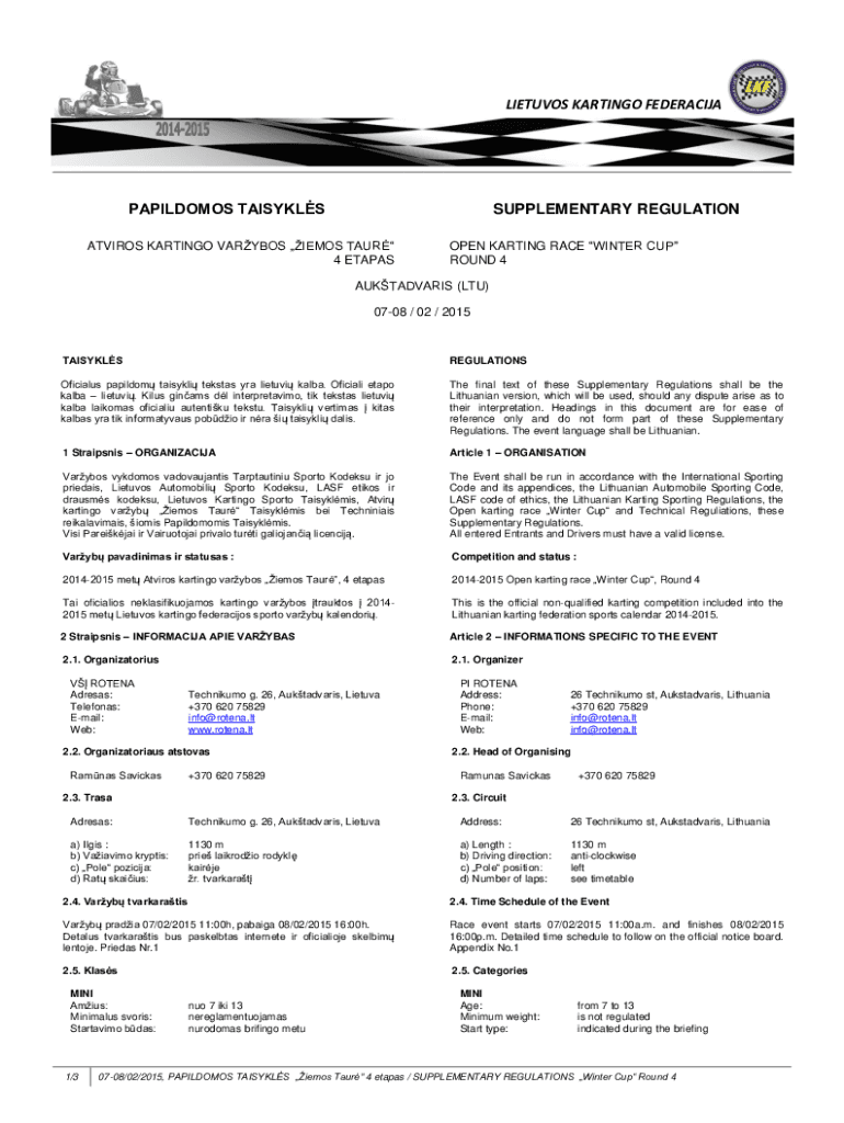 LIETUVOS KARTINGO FEDERACIJAPAPILDOMOS TAISYKLSSUPPLEMENTARY REGULATIONATVIROS KARTINGO VARYBOS IEMOS TAUR 4 ETAPASOPEN KARTING RACE WINTER CUP ROUND 4AUKTADVARIS (LTU) 0708 / 02 / 2015TAISYKLSREGULATIONSOficialus