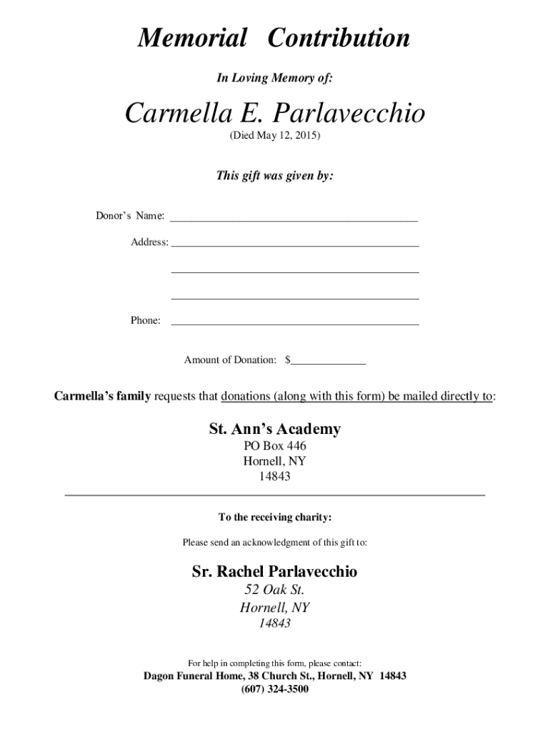 Memorial Contribution In Loving Memory of:Carmella E. Parlavecchio (Died May 12, 2015)This gift was given by: Donors Name: ___ Address: ___ ___ ___ Phone:___Amount of Donation: $___Carmellas family