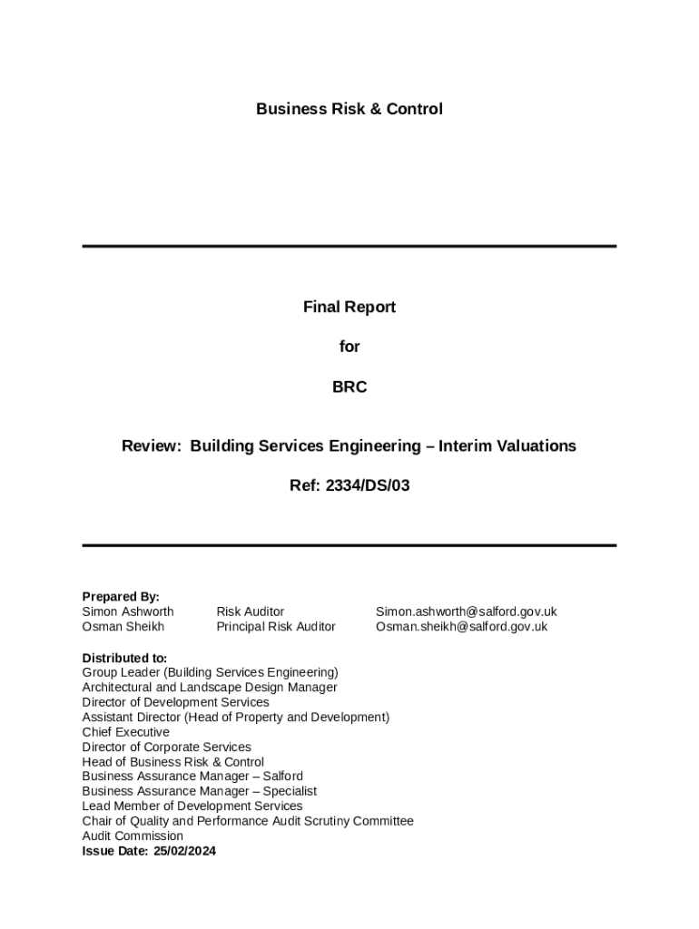 The Building Services EngineeringInterim Valuations Ref - services salford gov is a document needed to be submitted to the relevant address in order to provide specific info. It must be completed and signed, which is possible in hard copy, or via a certain software e. g. PDFfiller. It helps to fill out any PDF or Word document directly from your browser (no software requred), customize it depending on your requirements and put a legally-binding electronic signature. Once after completion, user can send the Building Services EngineeringInterim Valuations Ref - services salford gov to the relevant individual, or multiple individuals via email or fax. The blank is printable as well from PDFfiller feature and options offered for printing out adjustment. In both digital and physical appearance, your form will have a neat and professional look. It's also possible to save it as the template for further use, without creating a new document from scratch. You need just to customize the ready sample.
