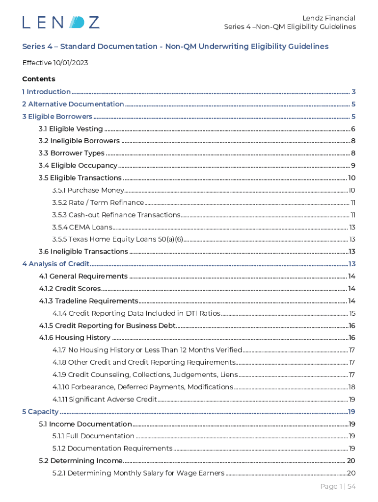 Lendz Financial Series 4 NonQM Eligibility GuidelinesSeries 4 Standard Documentation NonQM Underwriting Eligibility Guidelines Effective 10/01/2023 Contents 1 Introduction .......................................................................................................................................................................