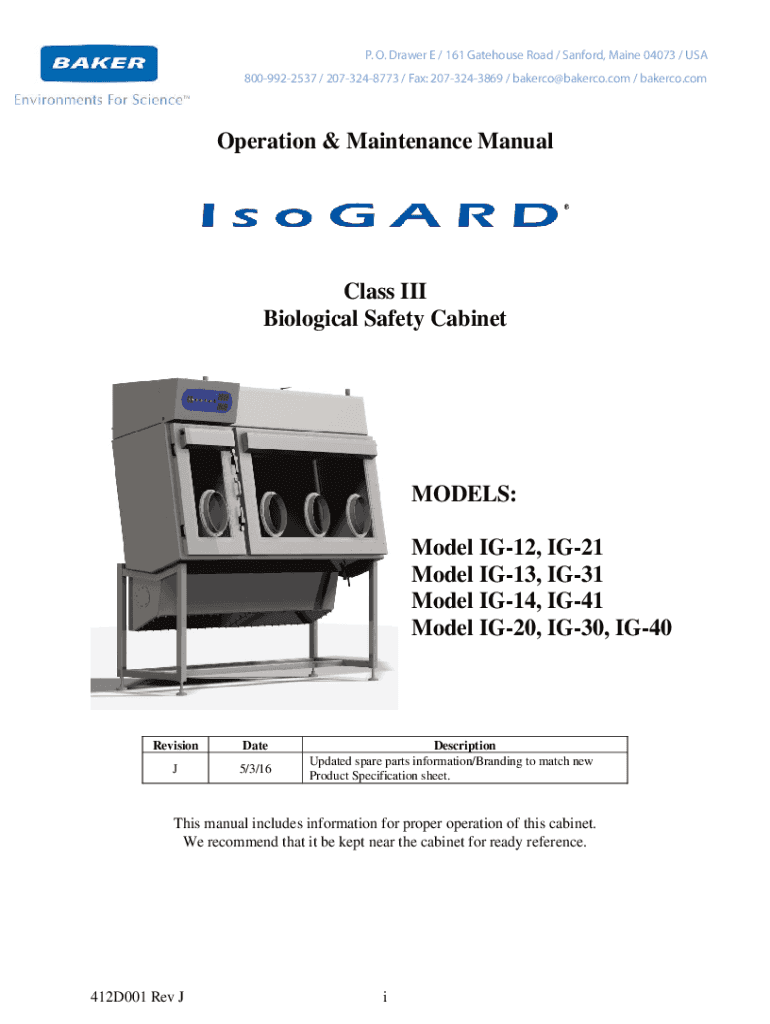 P. O. Drawer E / 161 Gatehouse Road / Sanford, Maine 04073 / USA 8009922537 / 2073248773 / Fax: 2073243869 / bakerco@bakerco.com / bakerco.comOperation & Maintenance ManualClass III Biological Safety