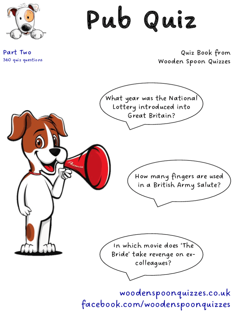 Pub Quiz Part Two360 quiz questionsQuiz Book from Wooden Spoon QuizzesWhat year was the National Lottery introduced into Great Britain?How many fingers are used in a British Army Salute?In which movie