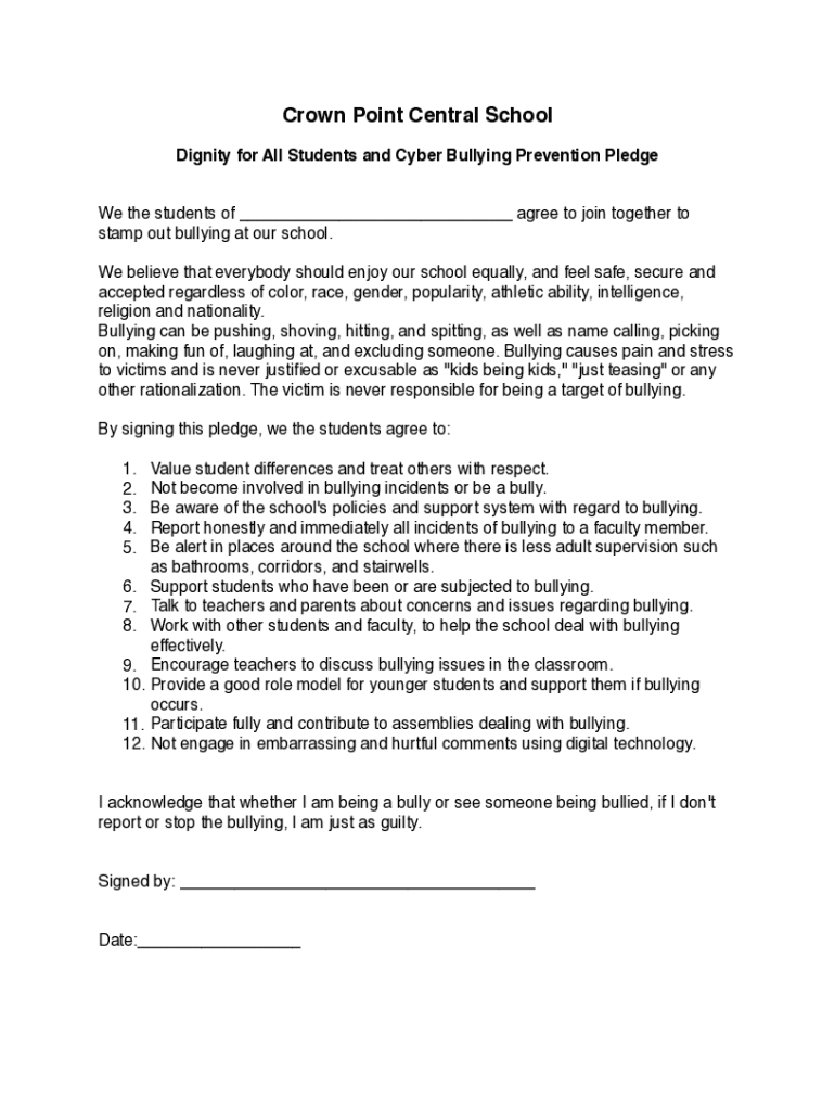 Crown Point Central School Dignity for All Students and Cyber Bullying Prevention Pledge We the students of ___ agree to join together to stamp out bullying at our school. We believe that everybody