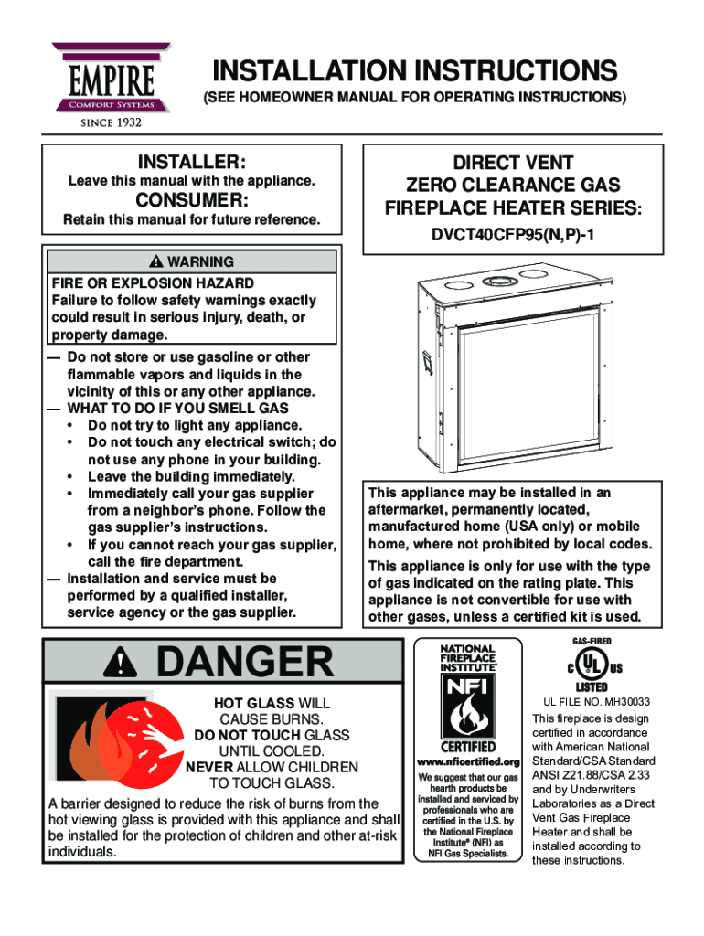 INSTALLATION INSTRUCTIONS (SEE HOMEOWNER MANUAL FOR OPERATING INSTRUCTIONS)INSTALLER: Leave this manual with the appliance.CONSUMER: Retain this manual for future reference.DIRECT VENT ZERO CLEARANCE
