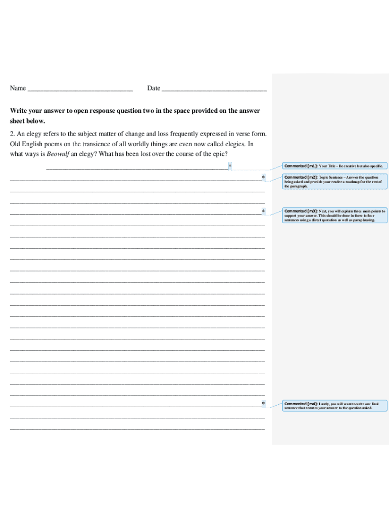 Name ___Date ___Write your answer to open response question two in the space provided on the answer sheet below. 2. An elegy refers to the subject matter of change and loss frequently expressed in