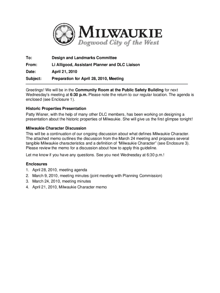 To:Design and Landmarks CommitteeFrom:Li Alligood, Assistant Planner and DLC LiaisonDate:April 21, 2010Subject:Preparation for April 28, 2010, MeetingGreetings! We will be in the Community Room at