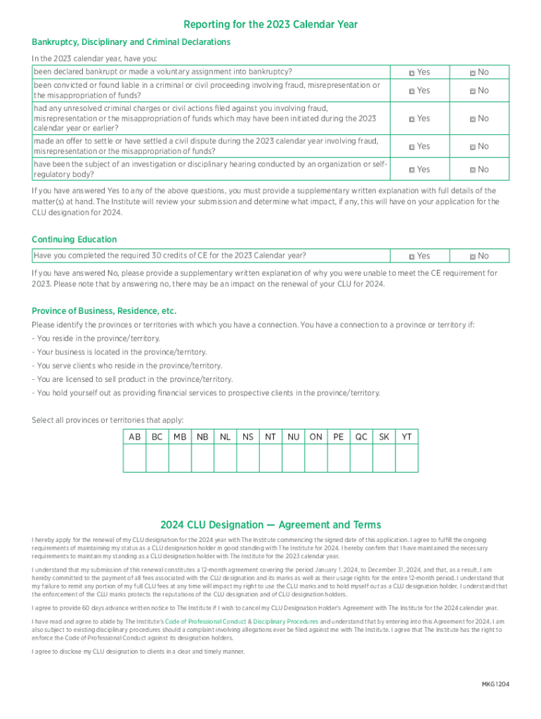 Send Completed Form To: Email: info@advocis.ca Mail To:The Institute 10 Lower Spadina Avenue, Suite 600 Toronto, ON M5V 2Z2CLU Designation Holders Agreement for 2024 Renewal of your CLU Designation