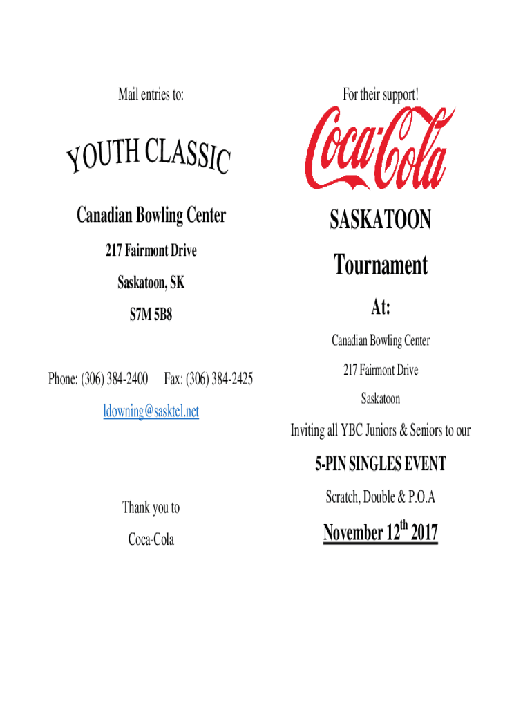 Mail entries to:For their support!Canadian Bowling CenterSASKATOON217 Fairmont Drive Saskatoon, SK S7M 5B8Tournament At: Canadian Bowling CenterPhone: (306) 3842400Fax: (306) 3842425ldowning@sasktel.net217