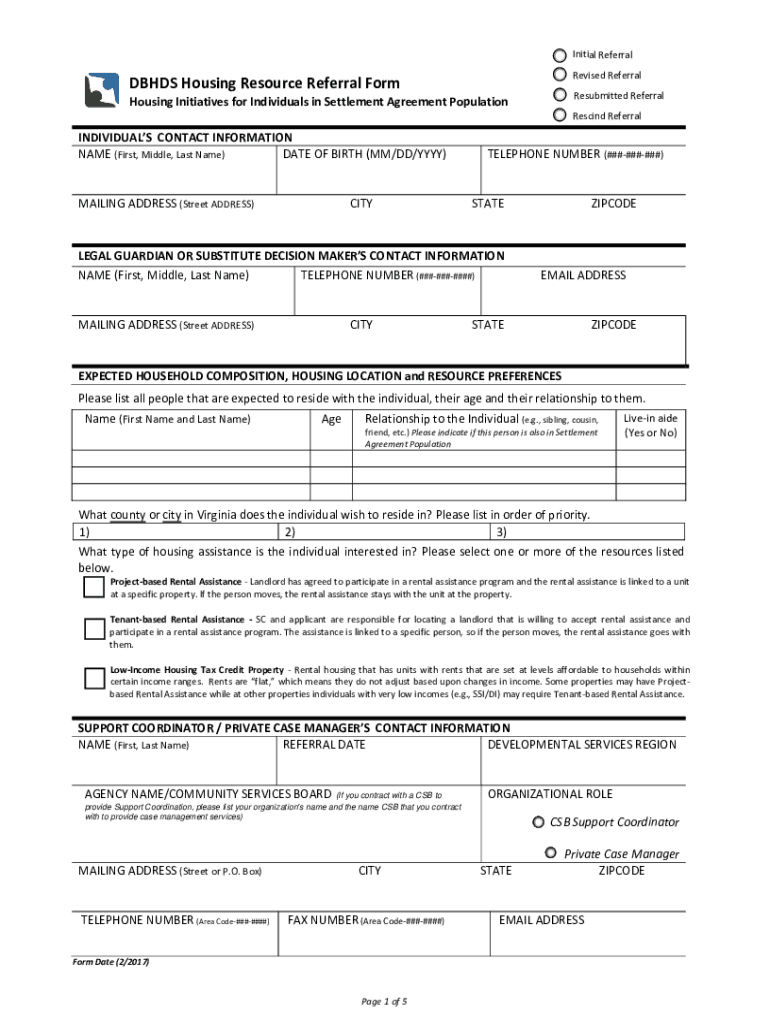 DBHDS Housing Resource Referral FormHousing Initiatives for Individuals in Settlement Agreement PopulationReferral Submission Instructions:Referrals must be submitted by the person\'s Support Coordinator/Private