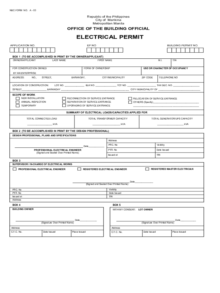 NBC FORM NO. A 03Republic of the Philippines City of Marikina Metropolitan ManilaOFFICE OF THE BUILDING OFFICIALELECTRICAL PERMITAPPLICATION NO.BUILDING PERMIT NO.EP NOBOX 1 (TO BE ACCOMPLISHED IN