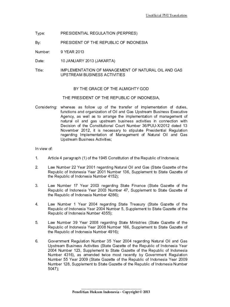 Unofficial PHI TranslationType:PRESIDENTIAL REGULATION (PERPRES)By:PRESIDENT OF THE REPUBLIC OF INDONESIANumber:9 YEAR 2013Date:10 JANUARY 2013 (JAKARTA)Title:IMPLEMENTATION OF MANAGEMENT OF NATURAL