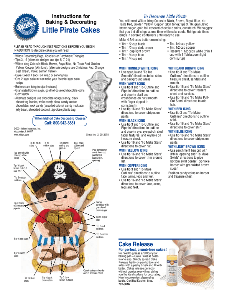 Instructions for Baking & DecoratingLittle Pirate Cakes PLEASE READ THROUGH INSTRUCTIONS BEFORE YOU BEGIN. IN ADDITION, to decorate cakes you will need: Wilton Decorating Bags, Couplers or Parchment