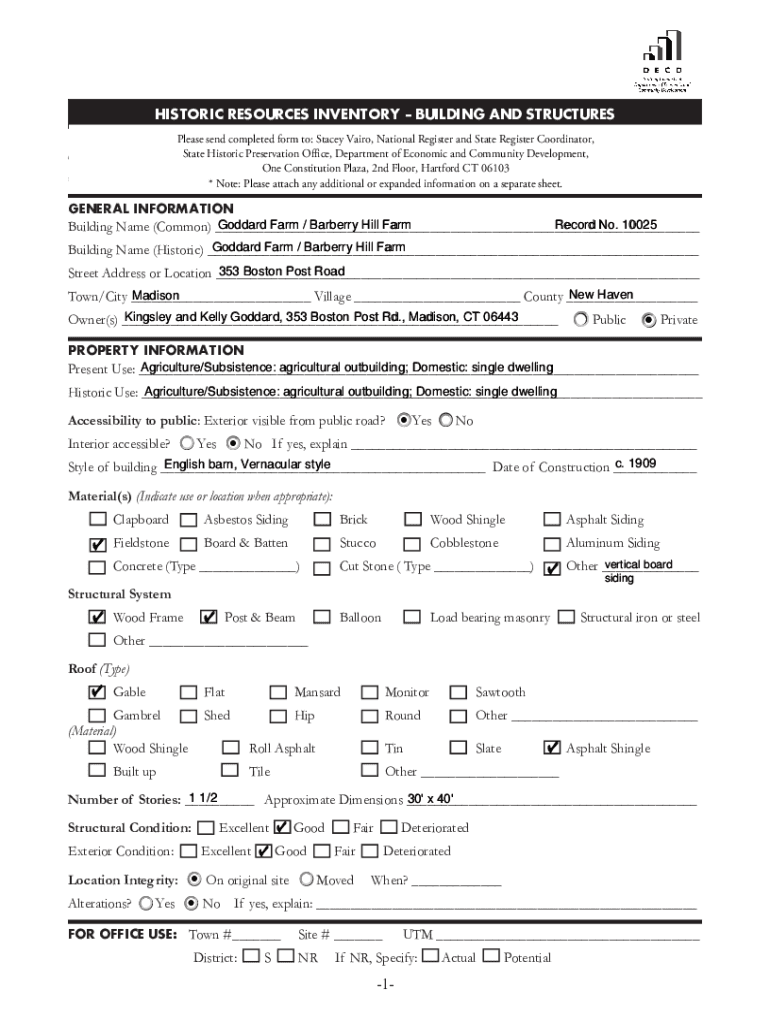 HISTORIC RESOURCES INVENTORY BUILDING AND STRUCTURES Please send completed form to: Stacey Cairo, National Register and State Register Coordinator, State Historic Preservation Office, One Department