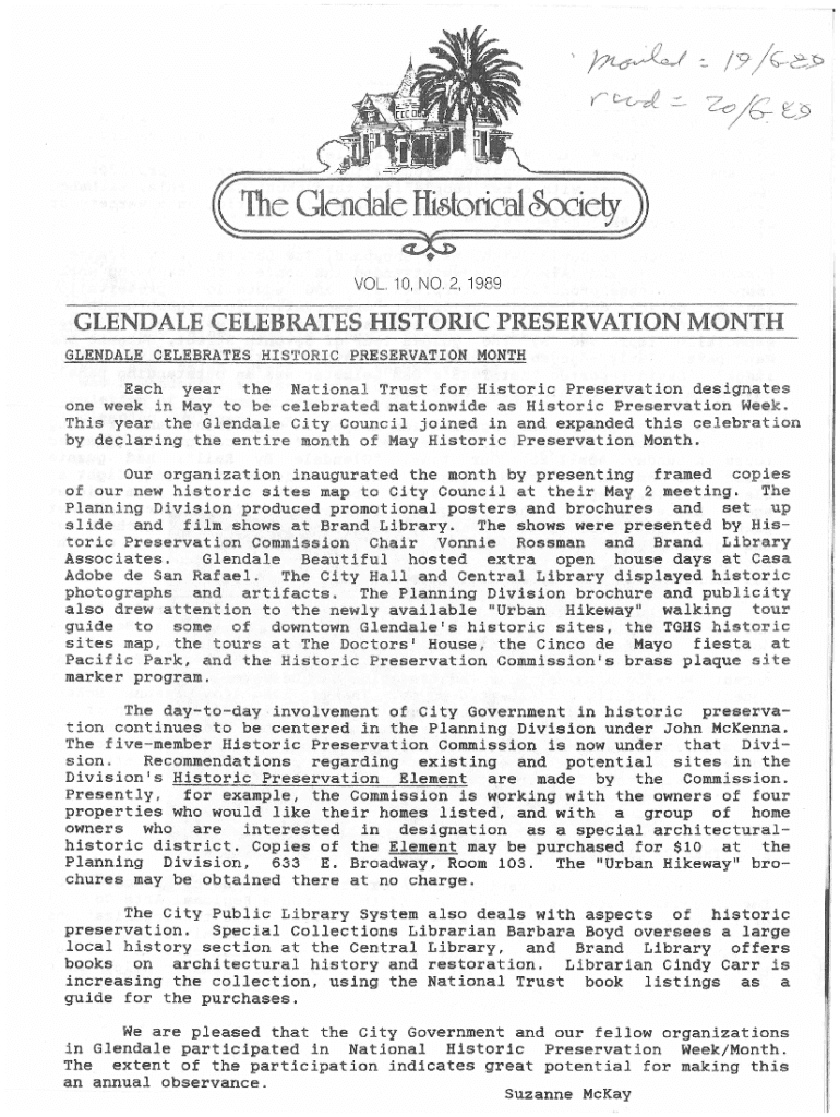I /Y/f: Z?/6;9nie Glendale Historical &1ciety VOL. 10, NO. 2, 1989GLENDALE CELEBRATES HISTORIC PRESERVATION MONTH GLENDALE CELEBRATES HISTORIC PRESERVATION MONTH Each year the National Trust for Historic