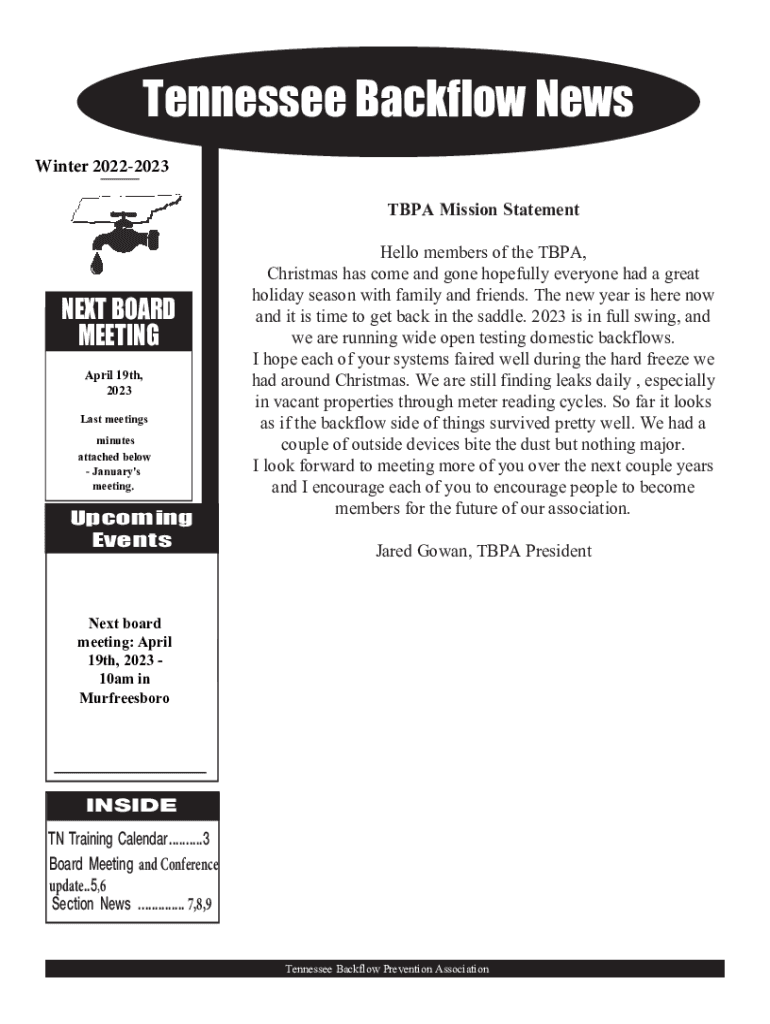 Tennessee Backflow News Winter 20222023 TBPA Mission StatementNEXT BOARD MEETING April 19th, 2023 Last meetings minutes attached below January\'s meeting.Upcoming EventsHello members of the TBPA,