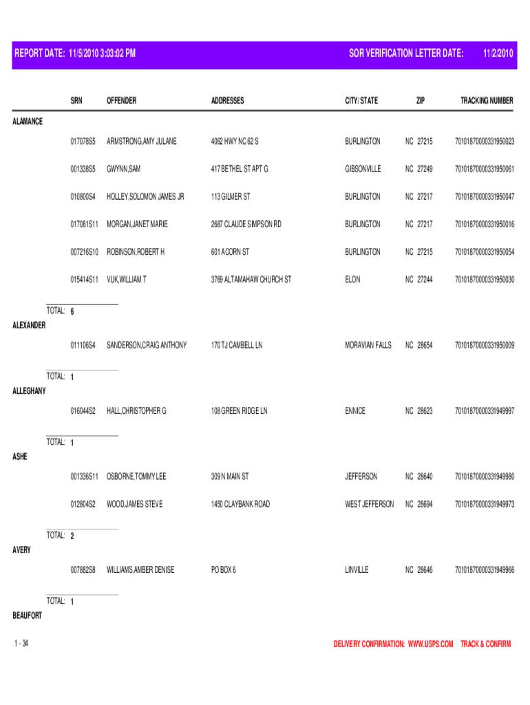 REPORT DATE: 11/5/2010 3:03:02 PMSOR VERIFICATION LETTER DATE:11/2/2010SRNOFFENDERADDRESSESCITY/ STATEZIPTRACKING NUMBER017078S5ARMSTRONG,AMY JULANE4062 HWY NC 62 SBURLINGTONNC 2721570101870000331950023001338S5GWYNN,SAM417