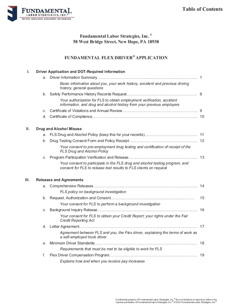 Table of ContentsFundamental Labor Strategies, Inc. 58 West Bridge Street, New Hope, PA 18938 FUNDAMENTAL FLEX DRIVER APPLICATION I.Driver Application and DOTRequired Information a. Driver Information
