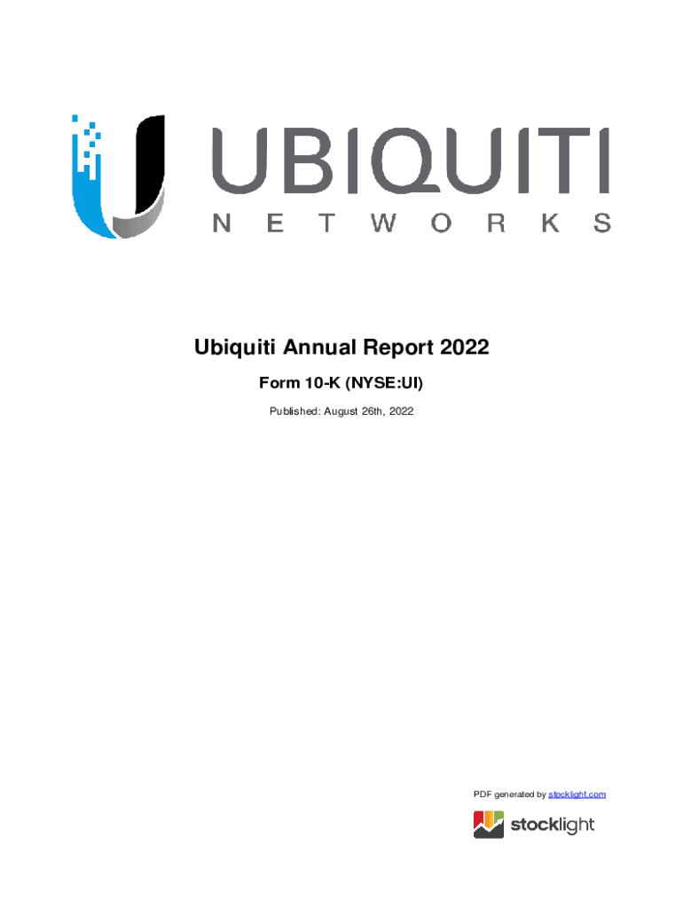 Ubiquiti Annual Report 2022 Form 10K (NYSE:UI) Published: August 26th, 2022PDF generated by stocklight.comUNITED STATES SECURITIES AND EXCHANGE COMMISSION WASHINGTON, D.C. 20549FORM 10K (Mark One)ANNUAL